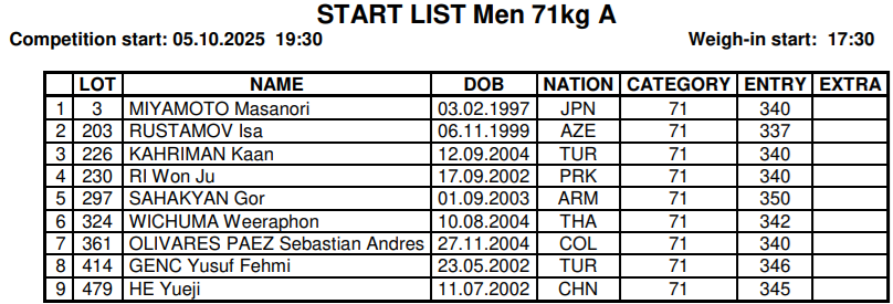 В мужской части турнира конкуренция не менее острая. В числе главных фаворитов на победу значатся прошлогодний чемпион мира в весе (до 67 кг) северокореец Ли Вон Джу и обладатель золота ЧМ-2023 в Эр-Рияде (до 73 кг), Вице-олимпийский чемпион Паприжа-2024 таиландский мастер Вирапхон Вичума.