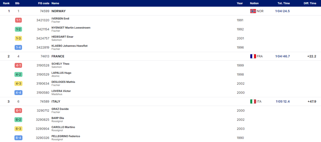 Главным фаворитом предстоящей гонки является сборная Норвегии. Тренерский штаб «норгов» выставил следующий состав: забойщиком будет Эмиль Иверсен, второй этап Мартин Лёвстрём Нюэнгет, следом выступит Эйнар Хедегарт, а финишером станет «легендарный» Йоханнес Хёсфлот Клебо. Клебо выиграл все предыдущие три гонки, и таким образом собрал 8-мь золотых медалей Олимпийских игр. Сегодня, у него отличный шанс установить новый рекорд и забрать 9-е золото.