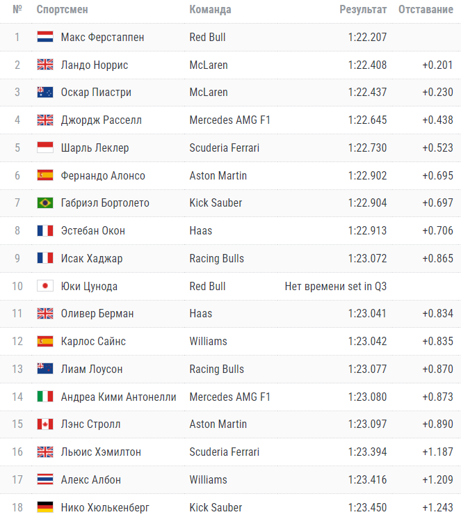 Замкнул тройку действующий чемпион Ф-1 нидерландец Макс Ферстаппен. У Макса более существенное отставание (+0.124).