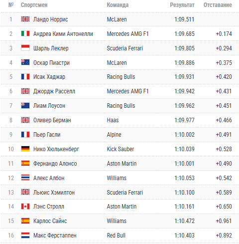 На вчерашней свободный практике лучшее время показал пилот «Макларен» Ландо Норрис. Британец выдал свой лучший круг с результатом 1:09.975 тысячные секунды.
