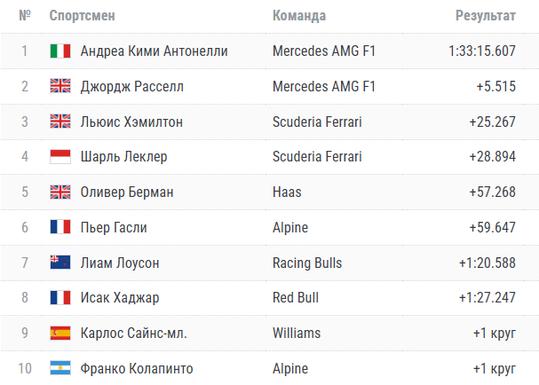 Второй результат и место в решетке у напарника Андреа, — британца Джордж Расселл (+0.222). Замкнул тройку и стартующих гонщик «Феррари», именитый британец Льюис Хэмилтон.