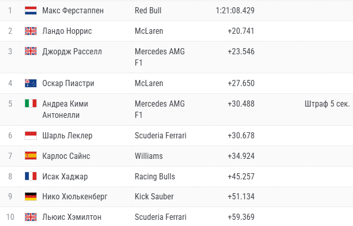 Второй результат у действующего чемпиона Ф-1 пилота «Ред Булл» — Макс Ферстаппена. Макс уступает лидеру — 0.323. Замкнет тройку гонщик «Феррари » испанец Карлос Сайнс-младший (+0.362).