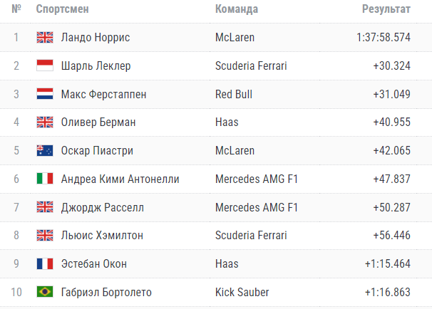 Второй результат у гонщика «Феррари» Шарля Леклера. Поляк уступил лидеру — 0.262. Замкнул тройку лучших напарник Леклера, — именитый британец Льюис Хэмилтон (+0.352).