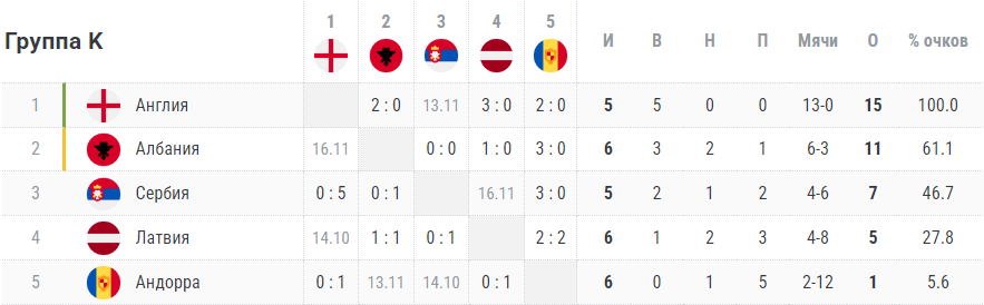 Футболисты из «Туманного Альбиона» возглавляют турнирную таблицу группы. Команда Томаса Тухеля одержала 5-ть побед с разницей забитых и пропущенных мячей (13-0). Впечатляющий результат, как и игра в исполнении вице-чемпиона Европы.