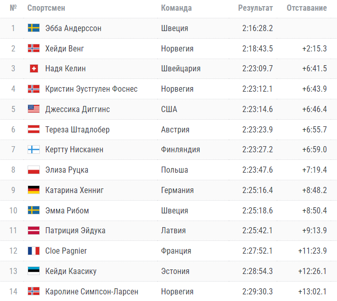 Второй стартовый номер у норвежки Каролин Симпсон-Ларсен. Третий у именитой шведки Эбба Андерссон. Эбба постарается реабилитироваться за провальную эстафету.