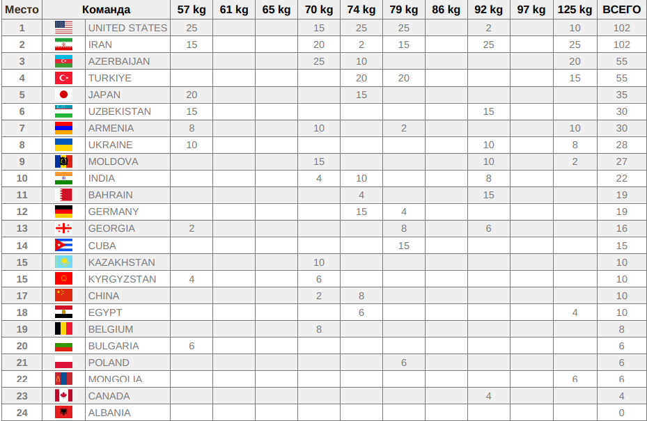Медальный зачет чемпионата мира по вольной борьбе 2025 года в Нови-Сад (Сербия). Обновляется…