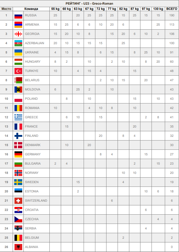Медальный зачет молодежного чемпионата Европы по греко-римской борьбе 2026 в Сербии. Итоговый.