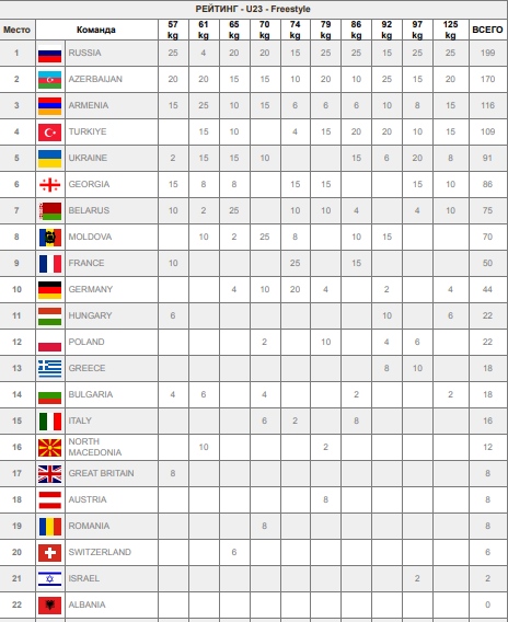 Победу в общекомандном зачете одержали россияне — 199 баллов. Второй результат у команды Азербайджана — 170. Замкнули тройку лидеров борцы Армении 116.