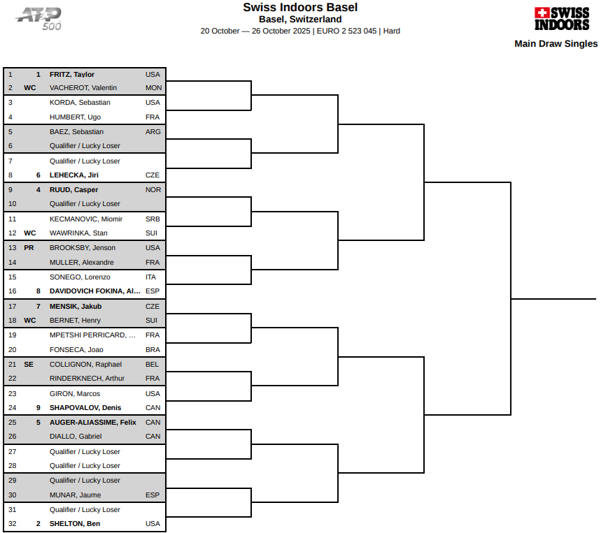 20 — 26 октября, на хардовых кортах Базеля (Швейцария) пройдет турнир серии ATP-500 по теннису «Swiss Indoors Basel-2025».