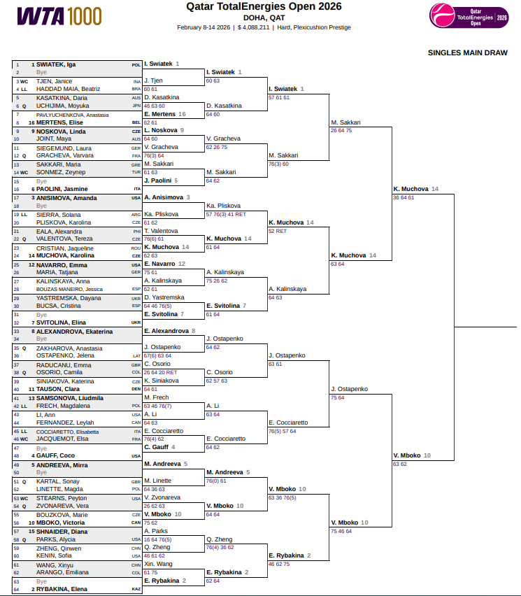 Предлагаем вам ознакамливаться с актуальной турнирной сеткой «тысячника» в Дохе (Катар). Кто с кем будет играть в следующих стадиях «Qatar TotalEnergies Open 2026».