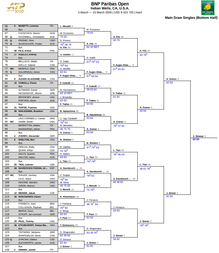 Предлагаем вам ознакамливаться с актуальной турнирной сеткой хардового супертурнира в Индиан-Уэллс. Кто с кем будет играть в следующих стадиях «BNP Paribas Open-2026».