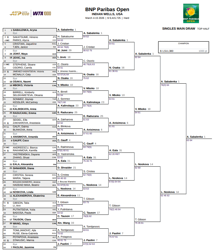 Сетка WTA 1000 в Индиан-Уэллс у женщин.
