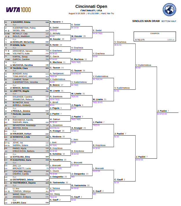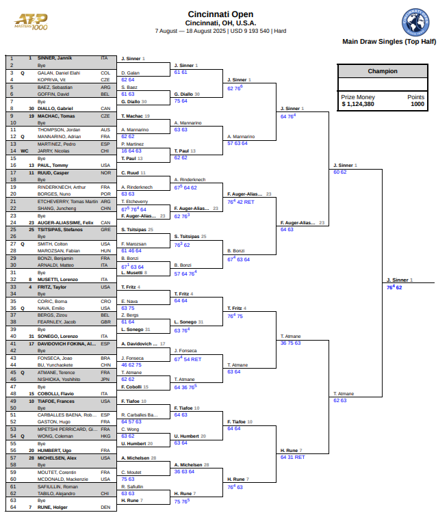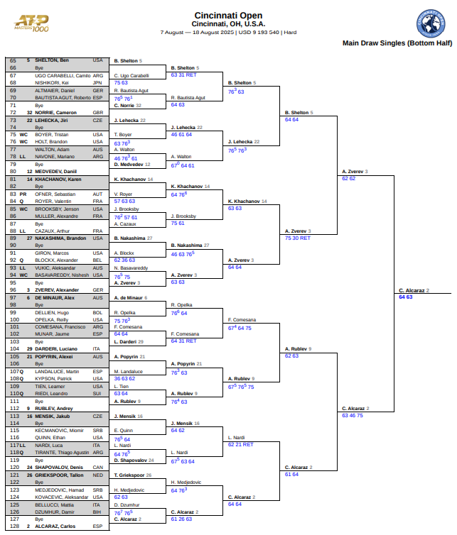 Предлагаем вам ознакамливаться с актуальной турнирной сеткой грунтового супертурнира в Цинциннати. Кто с кем будет играть в следующих стадиях «Cincinnati Open-2025».