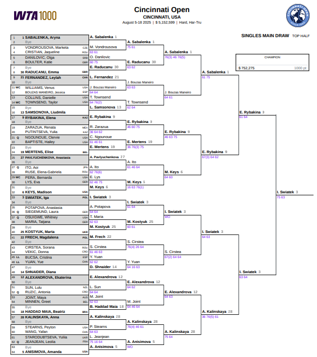 7 — 18 августа, на хардовых кортах Цинциннати (США) пройдет совмещенный супертурнир по теннису «Cincinnati Open-2025».