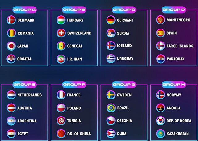 На текущем Мундиале примут участие 32 сборных, которые разделены на 8 групп по 4 команды. Три лучшие выступят в основном групповом этапе по результатам которого определятся участники плей-офф (1/4 финала).