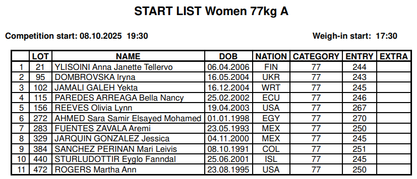 Крайне любопытная борьба нас ожидает сегодня. Сразу несколько тяжелоатлеток имеют реальную возможность побороться за победу. В числе главных претенденток на золото отметим Олимпийскую чемпионку Парижа-2024 (в весе до 71 кг) американку Оливию Ривз. Двукратную чемпионку мира (в категории до 76 кг) 2022-23 годов, именитую египтянку Сару Ахмед.