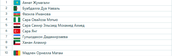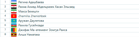 В женском дивизионе (до 77 кг) главная «звезда» 2-кратная чемпионка мира египтянка Сара Ахмед. Сборные Казахстана и Узбекистана представят Аянат Жумагали и Гулшодахон Дадамирзаева.