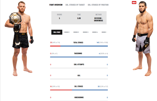 Поединок прошел под диктовку и за сценарием Ислама. У россиянина стабильно проходили тэйкдауны, просто извалял он соперника по настилу октагона.